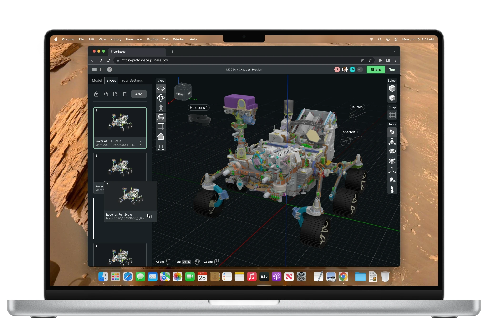 Engineers import their CAD models into the ProtoSpace web app to prepare for an immersive design review in AR. The team can view the model with a HoloLens headset or by joining the session remotely from their web browser.